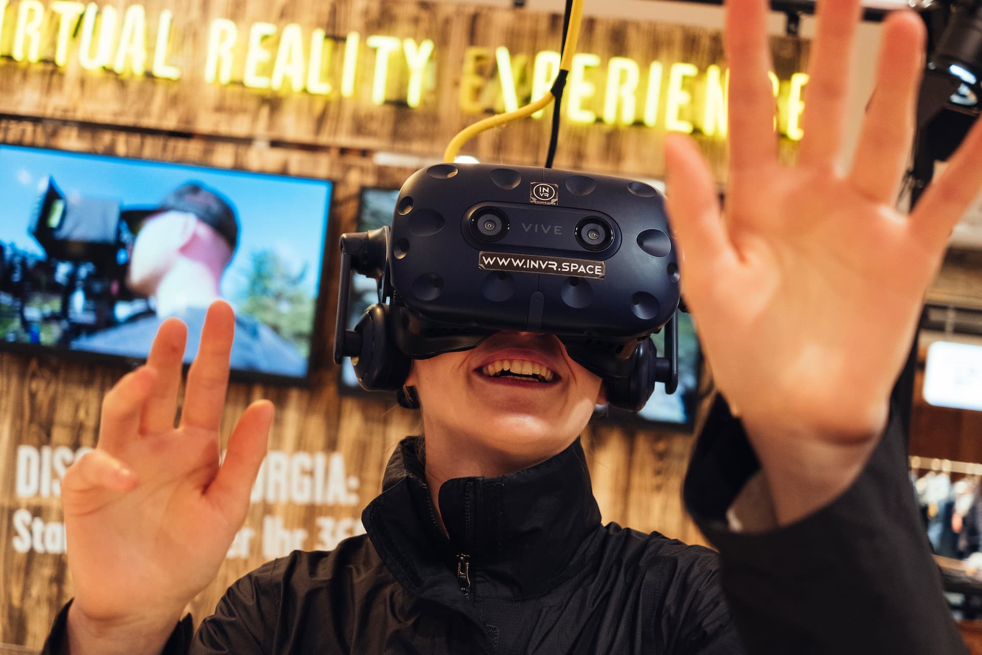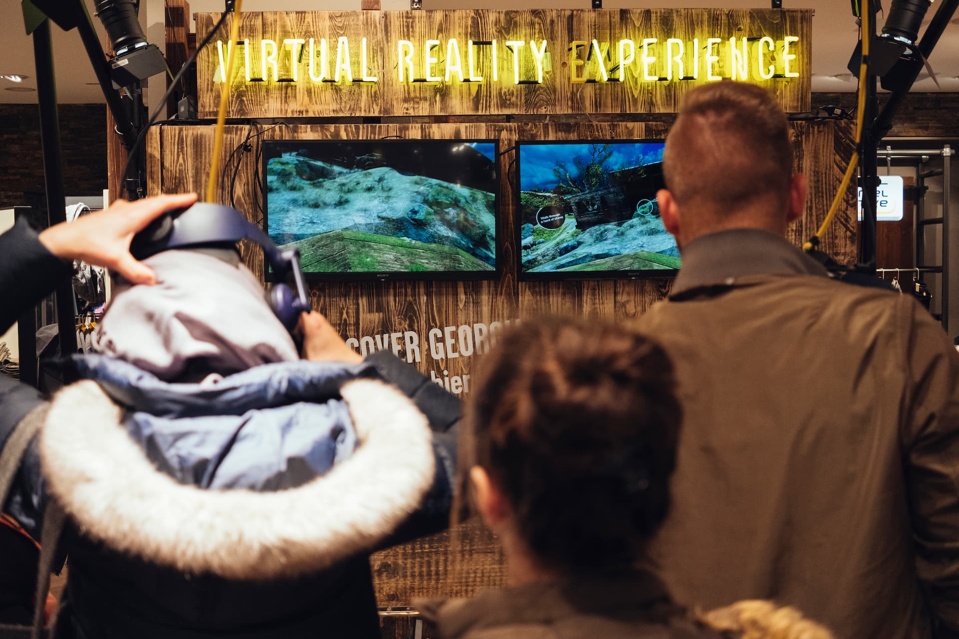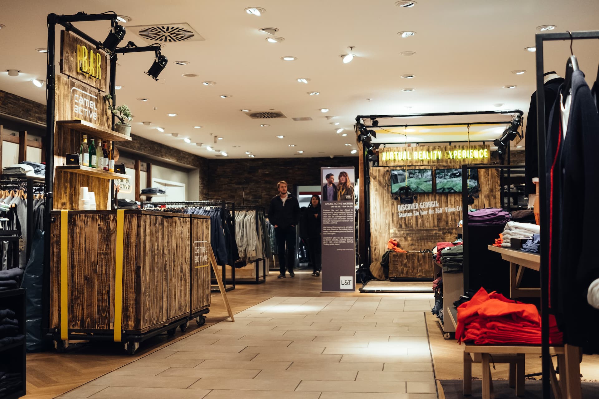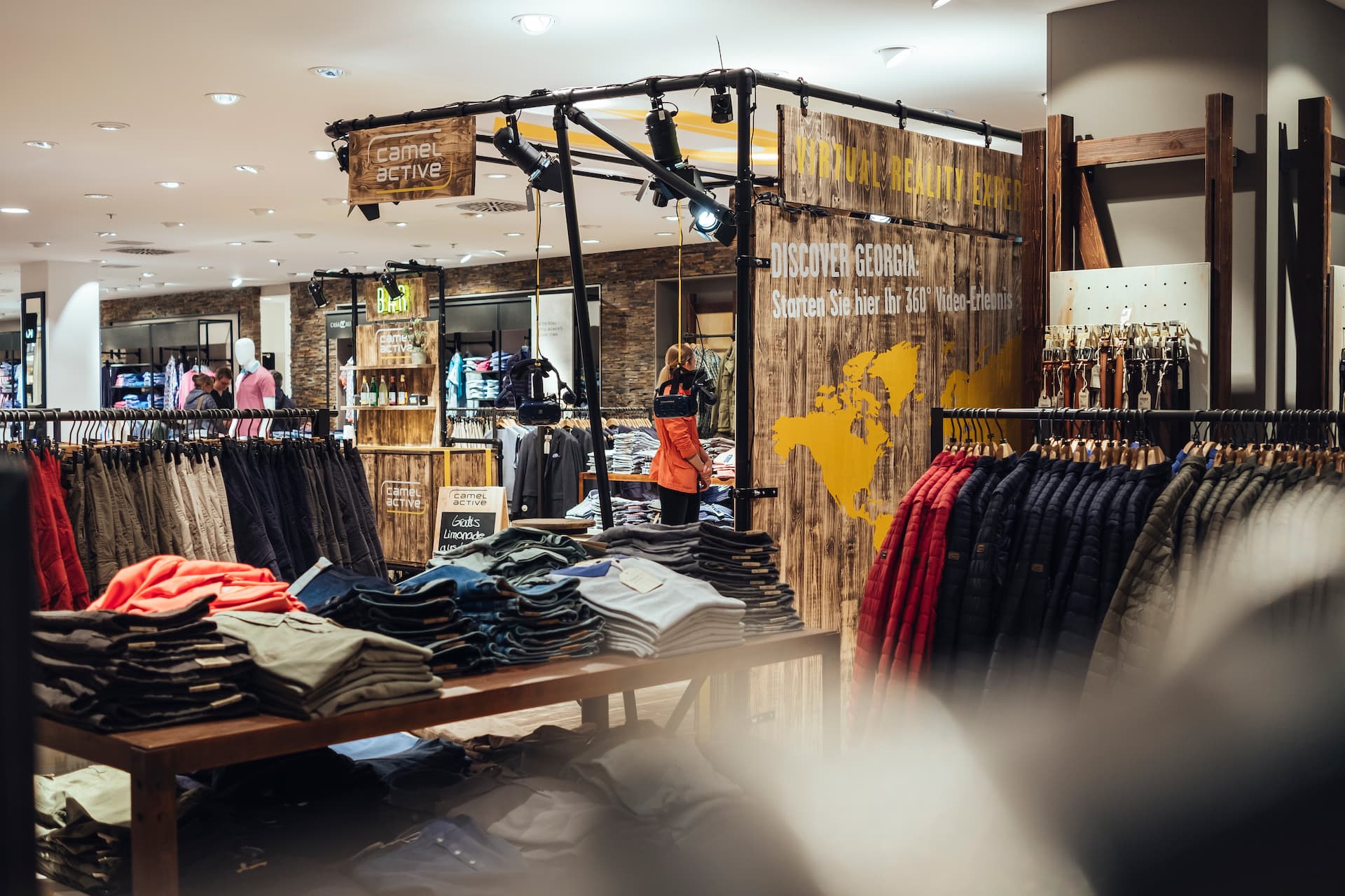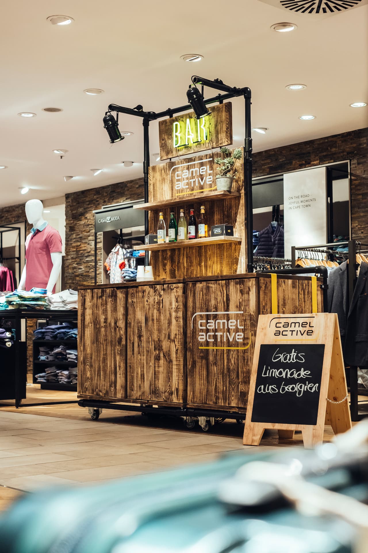 Hierfür designten wir zwei mobile Module, die mit ihrer rohen Holzoptik dem Look & Feel der camel active-Shops entsprechen und die Kunden zum Verweilen und Stöbern einladen. So konnten sie an der Bar original georgische Limonaden probieren und am VR-Modul mittels 360 Grad-Videos in die unberührte Natur Georgiens eintauchen.