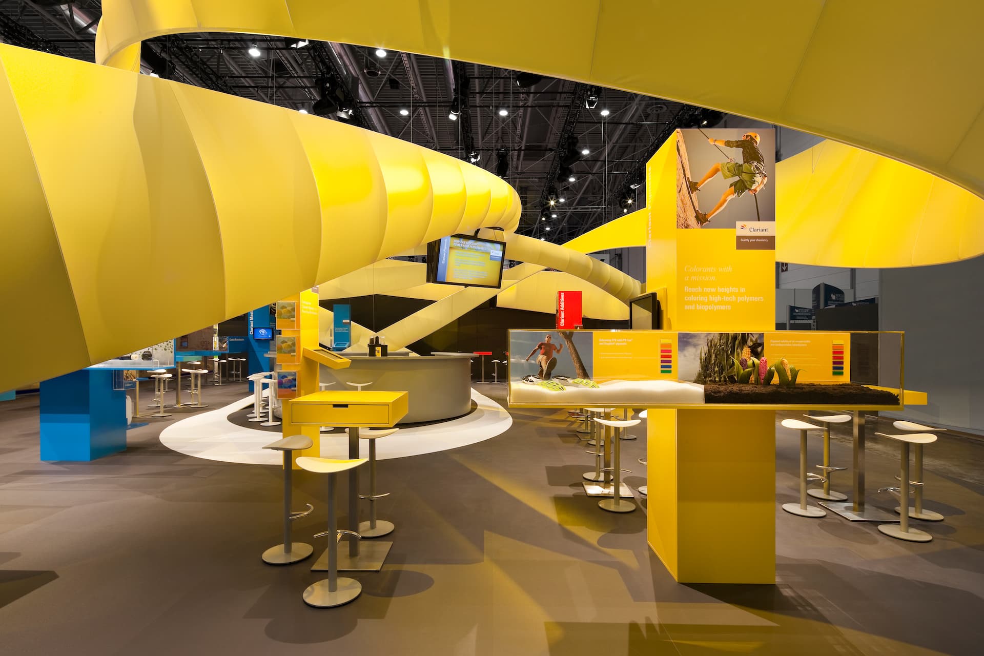 Die Raumskulptur durchzog dynamisch die gesamte Standfläche und schuf großzügige Gemeinschaftsbereiche, während gleichzeitig für intimere Gespräche beruhigte Zonen separiert wurden.