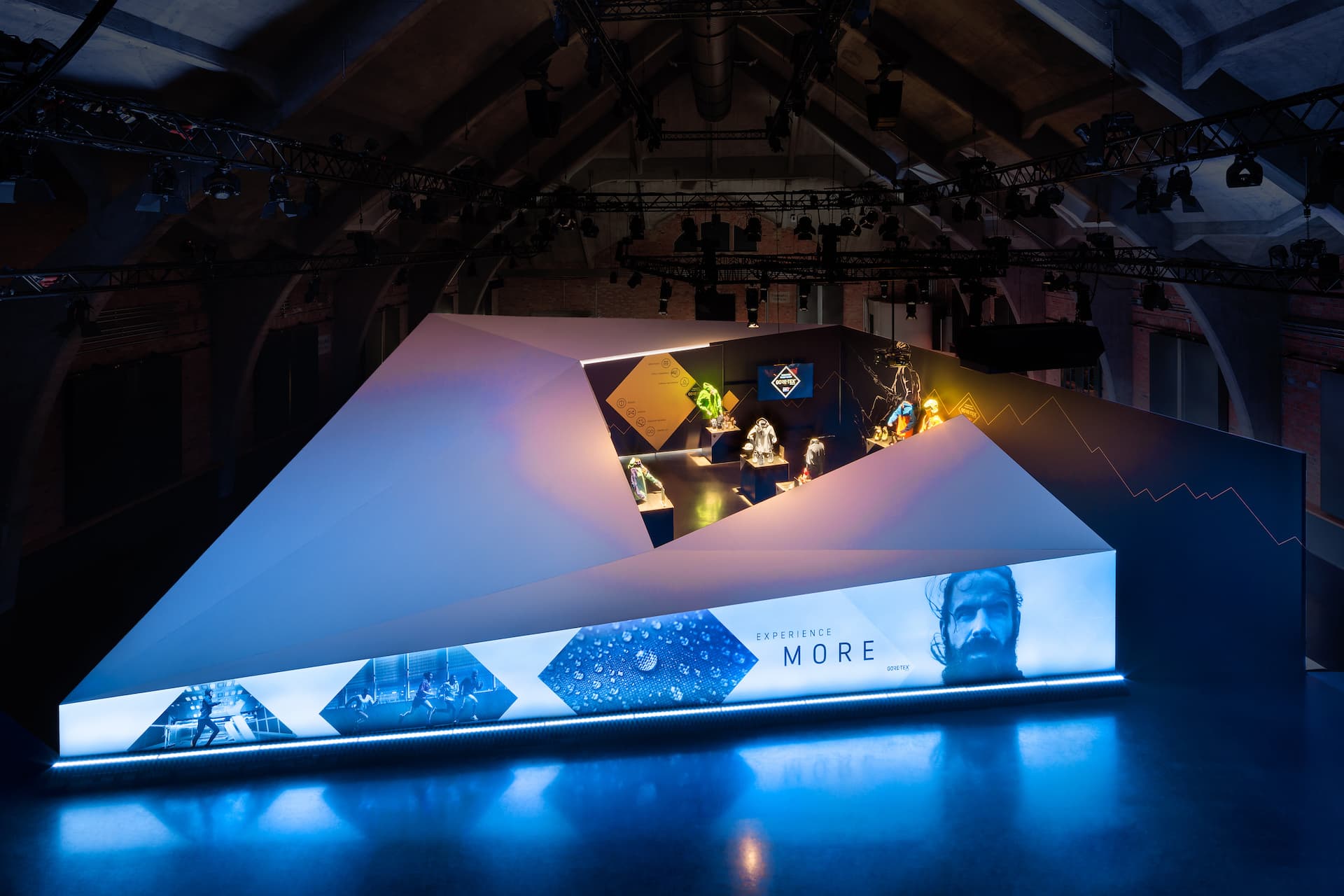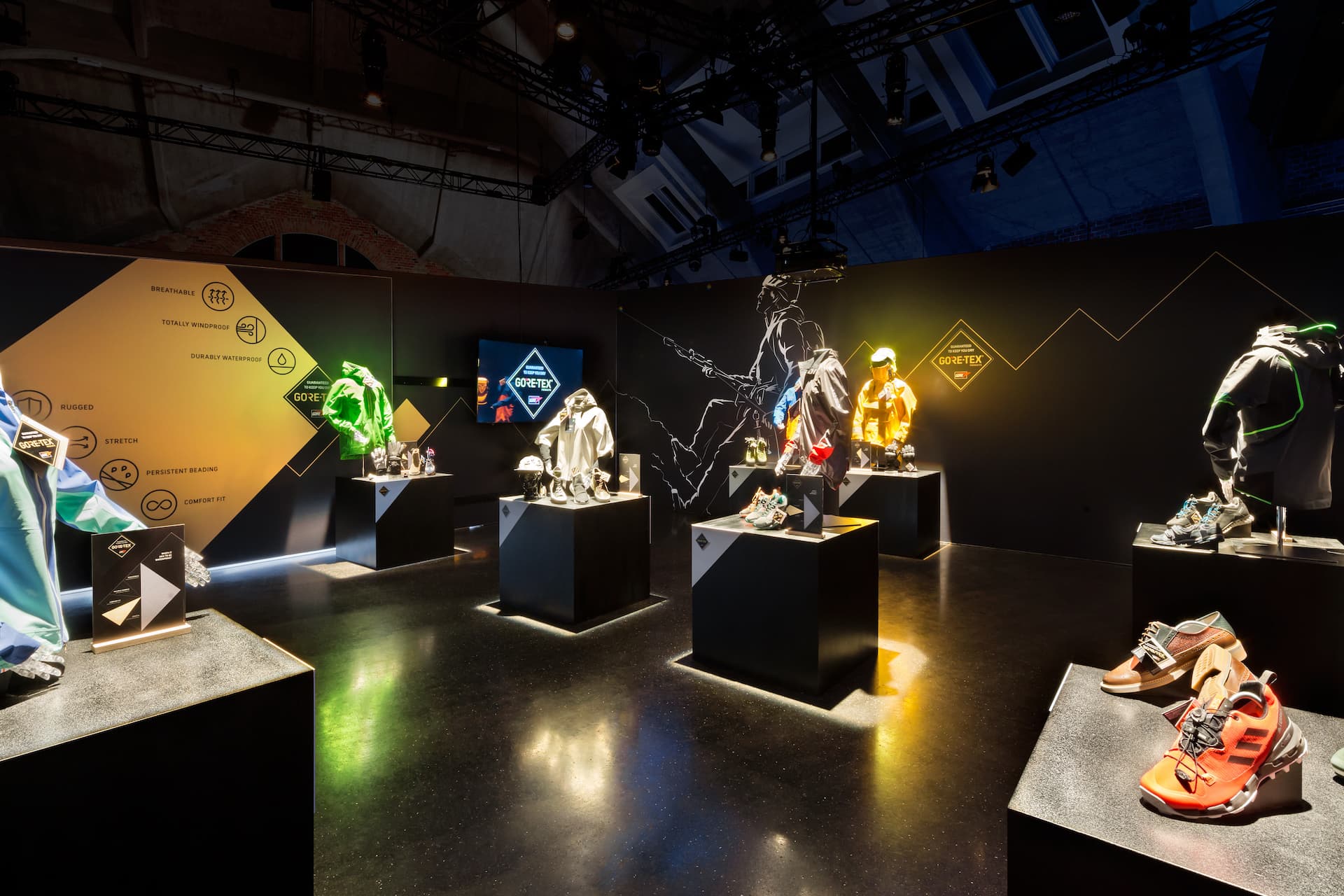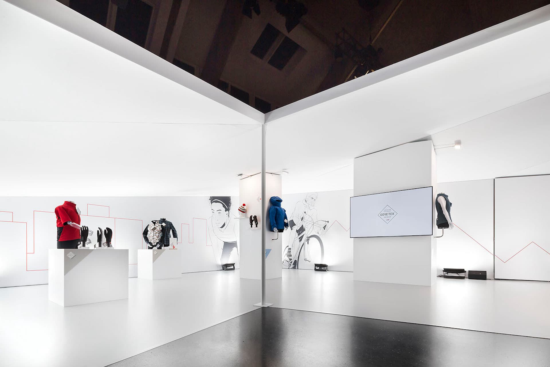 Zu diesem Zweck entwickelten wir einen dreidimensionalen Markendiamanten, der im Inneren die Black Label-Produkte von GORE-TEX präsentierte. Hier starteten die Besucher ihren Rundgang und bekamen so die Botschaft vermittelt: GORE-TEX bleibt sich und seinem Markenkern treu. Durch eine Tür gelangten die Besucher anschließend in den weiß gestalteten White Label-Bereich. Auf diese Weise erlebten sie die neuen Produkte als natürliche Evolution des bestehenden Portfolios. Ein Konzept, dass aufging: Viele Händler nutzten die Gelegenheit, um gleich an Ort und Stelle in die Vertragsverhandlungen einzusteigen.