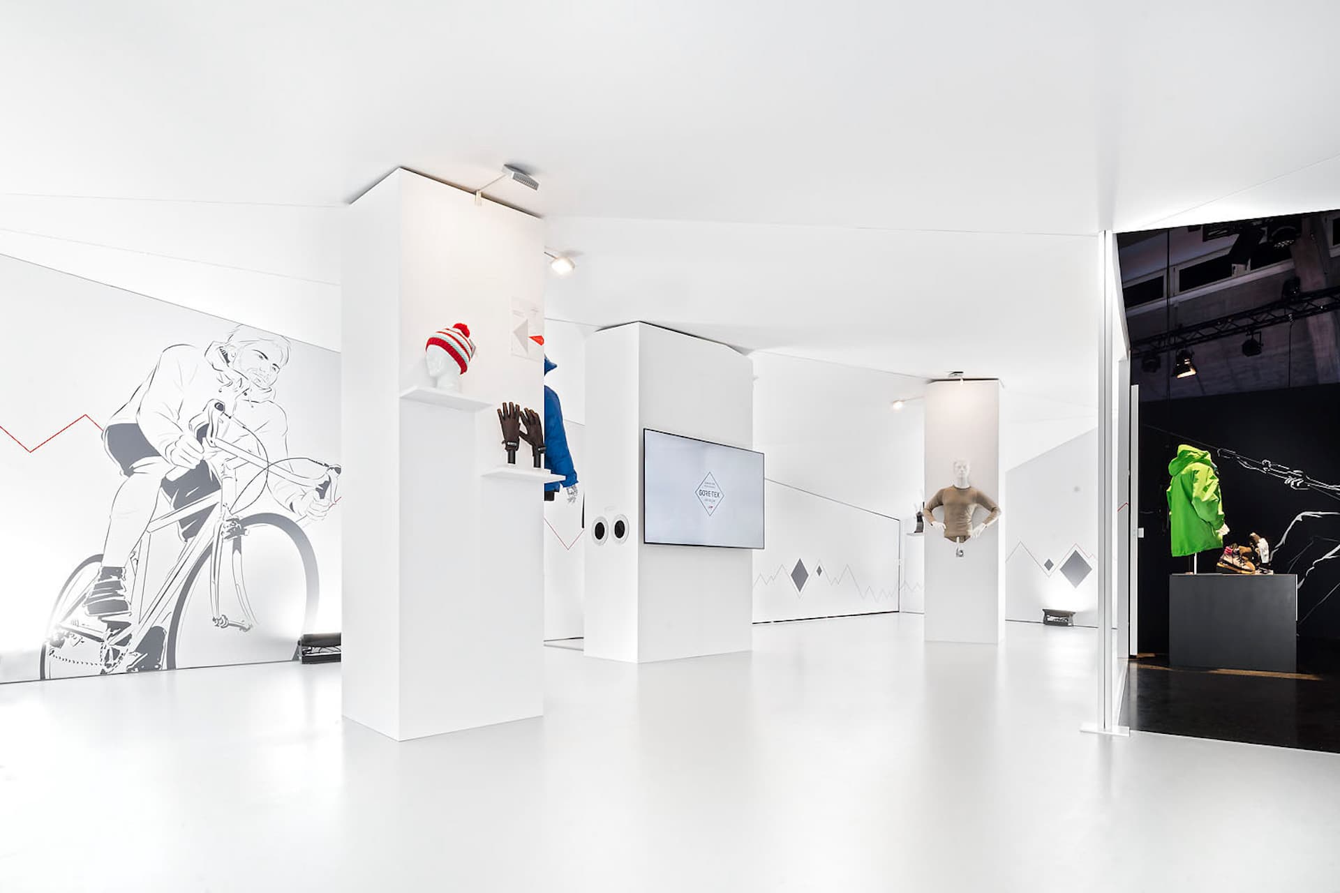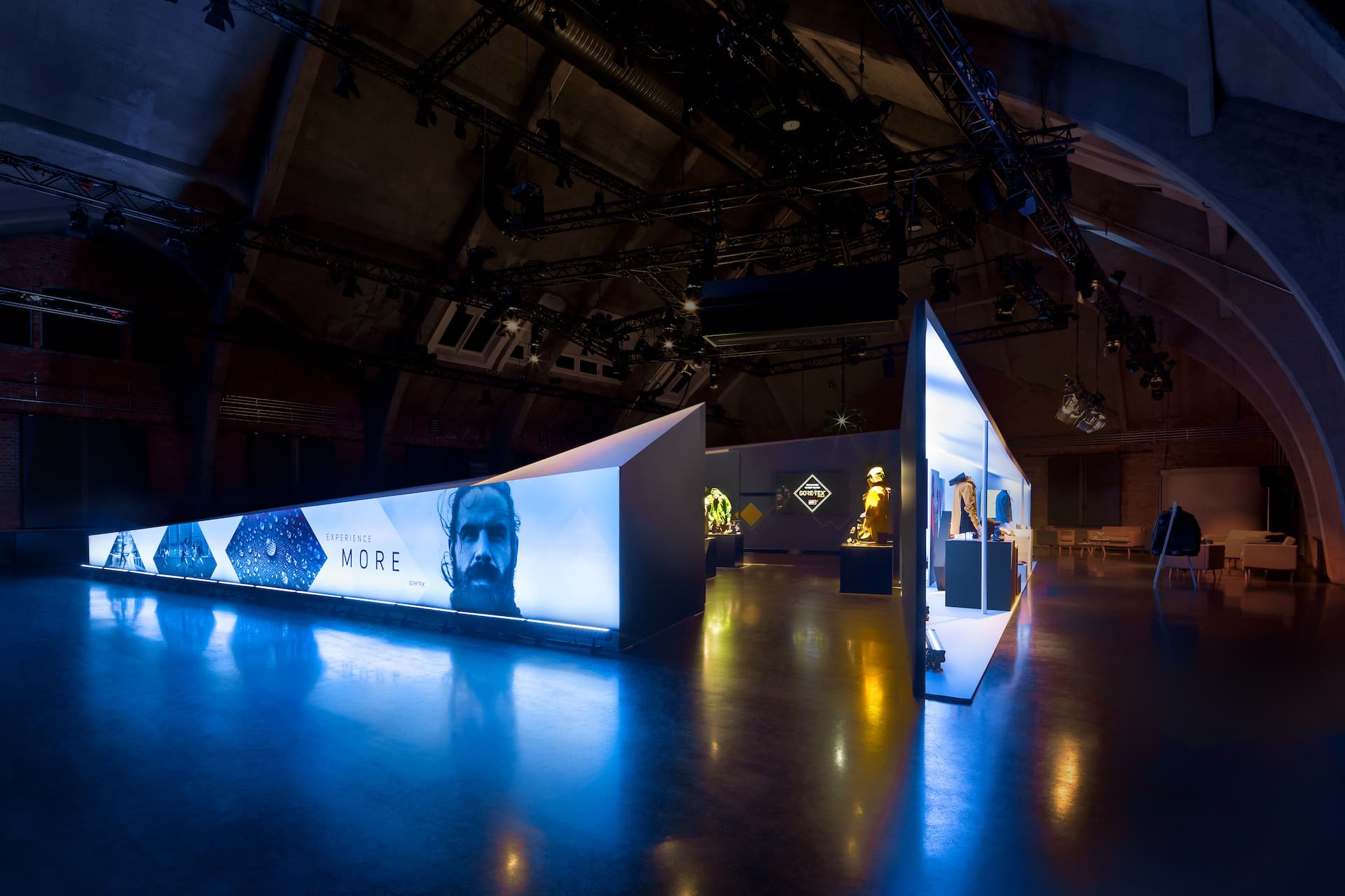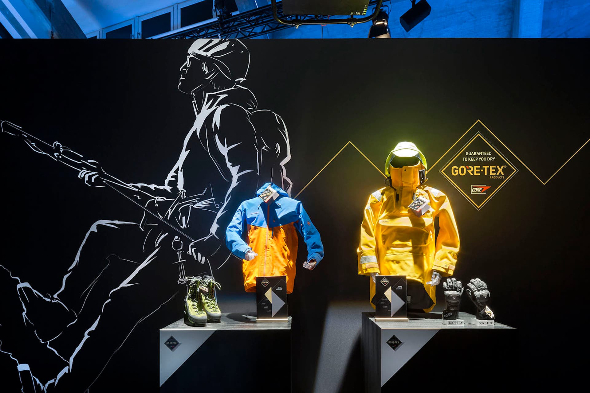 Zu diesem Zweck entwickelten wir einen dreidimensionalen Markendiamanten, der im Inneren die Black Label-Produkte von GORE-TEX präsentierte. Hier starteten die Besucher ihren Rundgang und bekamen so die Botschaft vermittelt: GORE-TEX bleibt sich und seinem Markenkern treu. Durch eine Tür gelangten die Besucher anschließend in den weiß gestalteten White Label-Bereich. Auf diese Weise erlebten sie die neuen Produkte als natürliche Evolution des bestehenden Portfolios. Ein Konzept, dass aufging: Viele Händler nutzten die Gelegenheit, um gleich an Ort und Stelle in die Vertragsverhandlungen einzusteigen.